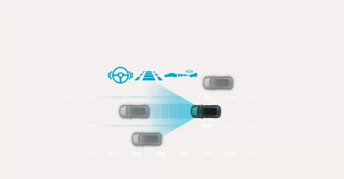 HDA permite controlul vitezei si a distantei pana la vehiculul din fata, precum si centrarea autovehiculului pe banda de deplasare, chiar si in cazul virajelor.